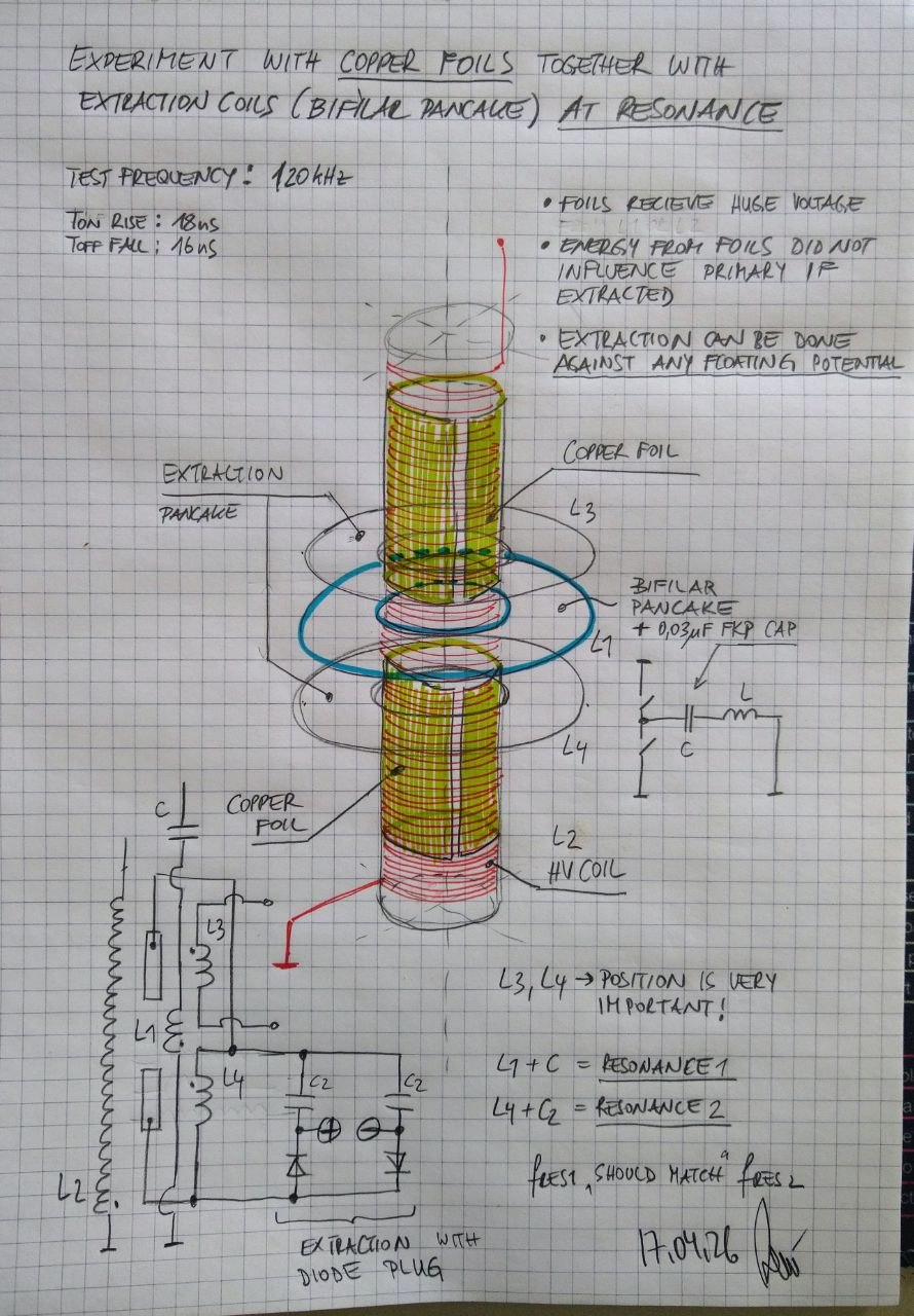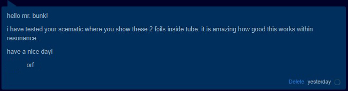 But essentially, it's a relatively small, simplified Kapanadze transformer. The secret is the use of simple aluminum layers inside the coil body, 2 split foils, for both halves of the form, the lower end foil is hit with a certain Positive pulse train, the first winding is held Negative, while the upper foil becomes INTENSELY active, and having an output on the heavy winding. Not a primary to secondary induction, but a rapid changing of voltages between the upper and lower foils, with a 50 hz interruption circuit. Rather than having to move massive currents to induce an output... he is alternating Voltages instead. Bunk has a small transformer like this, doing 4 kw off the 9v. Must see. I will try to upload more too for preservation here.