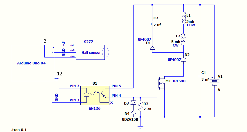 The control system will be done with an Arduino mega 2560 using a hall effect sensor S277 for detecting the position of the rotor relative to the magnets. On the hall sensor S277 that I recovered from a computer fan, only the DO output (pin 2) will be used to give the interrupt detection instruction (it is in the Arduino program) in order to activate a 6N136 optocoupler to give a pulse on the Gate of the Nmos IRF3205 which will activate the two coils in series of the motor as declared by the inventor Mr. Robert Adams.