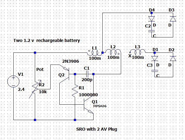 and the other is with my Self Resonant Oscillator SRO, like this with two AA batteries, Adjust pot R2 to get the desired output on both AV plugs. It will find the right resonant frequency automatically for you if you follow the schematic correctly.