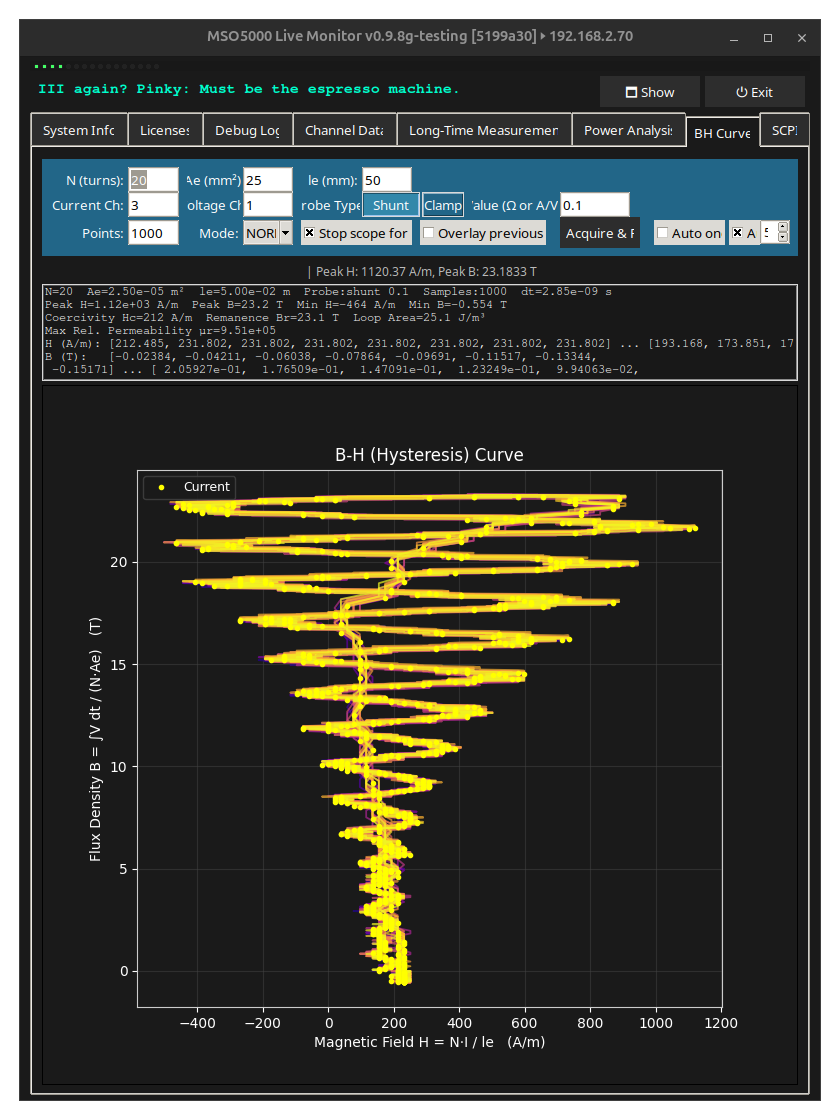 script will accept math channels on both input fields. the thing is, that a meaningful bh-curve should be done with using sinusoidal shapes. then the whole math behind will bring out what we can expect. when we change to pulsed systems with oszillating currents the situation changed completely. we have to deal with bias on our probes or timing differences and such. i'm still not sure how to deal with this. goal is to have a solid bh-curve which represents reality as much as possible.