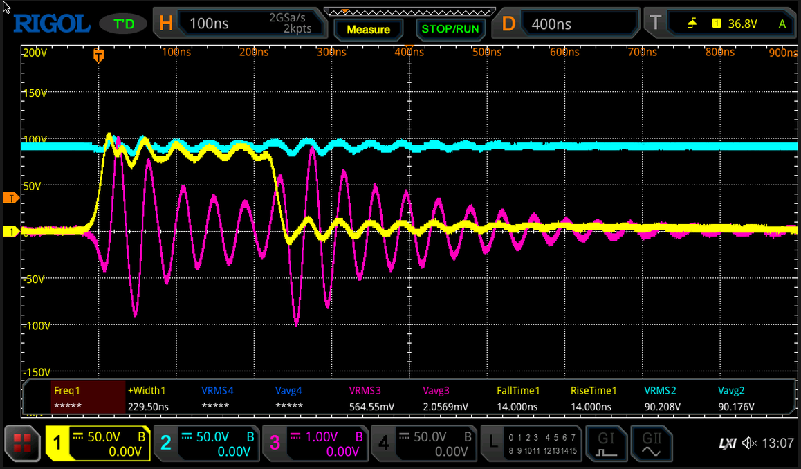 CH1 is input pulse, CH3 is current on low side of power supply. CH2 is voltage from power supply.