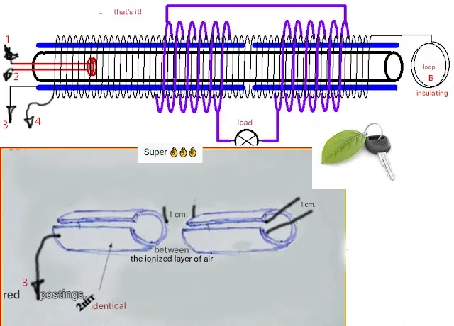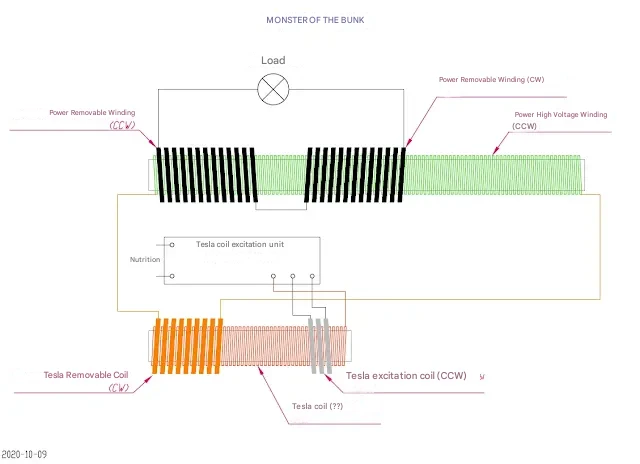 But essentially, it's a relatively small, simplified Kapanadze transformer. The secret is the use of simple aluminum layers inside the coil body, 2 split foils, for both halves of the form, the lower end foil is hit with a certain Positive pulse train, the first winding is held Negative, while the upper foil becomes INTENSELY active, and having an output on the heavy winding. Not a primary to secondary induction, but a rapid changing of voltages between the upper and lower foils, with a 50 hz interruption circuit. Rather than having to move massive currents to induce an output... he is alternating Voltages instead. Bunk has a small transformer like this, doing 4 kw off the 9v. Must see. I will try to upload more too for preservation here.