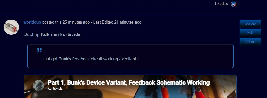 But essentially, it's a relatively small, simplified Kapanadze transformer. The secret is the use of simple aluminum layers inside the coil body, 2 split foils, for both halves of the form, the lower end foil is hit with a certain Positive pulse train, the first winding is held Negative, while the upper foil becomes INTENSELY active, and having an output on the heavy winding. Not a primary to secondary induction, but a rapid changing of voltages between the upper and lower foils, with a 50 hz interruption circuit. Rather than having to move massive currents to induce an output... he is alternating Voltages instead. Bunk has a small transformer like this, doing 4 kw off the 9v. Must see. I will try to upload more too for preservation here.