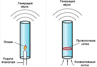 The simplest thermoacoustic machine consists of a resonator in the form of a tube and a regenerator made of a porous material, on the sides of which a temperature difference is created. In the simplest case, the regenerator can be a burner inserted inside the resonator (in the form of a vertically mounted glass tube) or a heated metal porous mesh, as shown in the figure below.