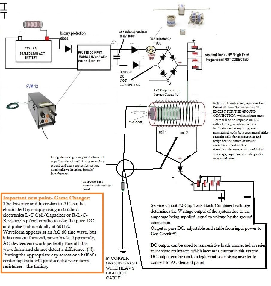 years ago that caused such a ruckus. The Inverter circuit already has the necessary components required. Disconnect the main diode bridge negative output from the output capacitor bank. Then hook the disconnected negative capacitor to a separate circuit which powers the load and into an adjustable earth grounding. At this point you are tapped into the universal source of endless energy. There is a simple way which does not require the inverter. Any how let me know and will work it out. You already have all the required parts as does most everyone else.